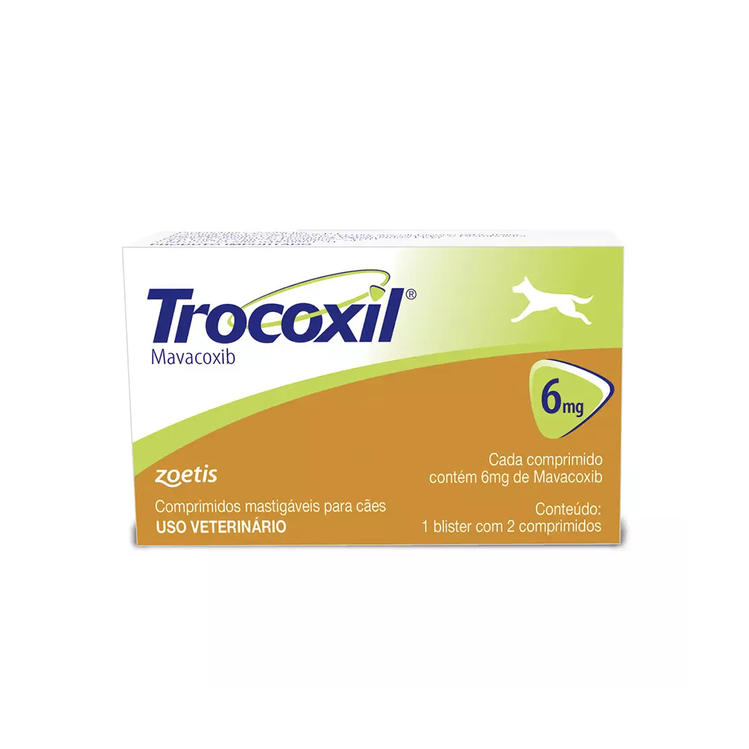 Trocoxil é um anti-inflamatório não-esteroidal usado para tratar dor e inflamação. É indicado no tratamento de dor e inflamação associados à doença articular degenerativa em cães, quando necessário tratamento por mais de um mês. Fórmula: Cada 100mg contém: Mavacoxib - 5mg Excipientes - 100mg