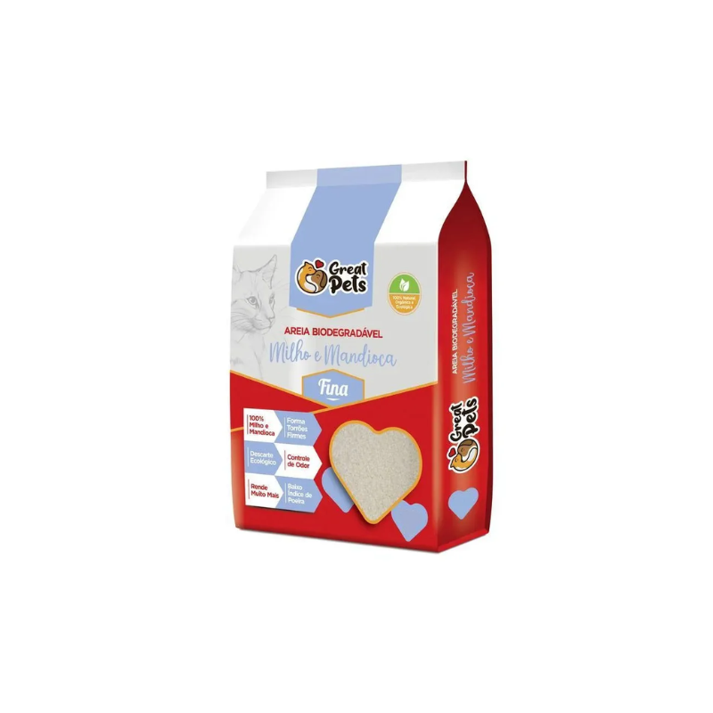 <p>Areia Higiênica Great Pets Biodegradável Fina A Areia Higiênica Great Pets Biodegradável Fina é uma opção de areia sanitária para gatos que é produzida com materiais naturais e biodegradáveis, tornando-a uma opção mais sustentável para o meio ambiente. Não contém produtos químicos nocivos, sendo segura para o uso dos gatos e para o contato humano. Além disso, por ser biodegradável ela pode ser descartada no vaso sanitário, o que facilita o processo de limpeza e descarte Benefícios: Indicada para gatos de todas as raças; Biodegradável; Forma torrões firmes e flexíveis; Super absorvente; Não forma lama; Pode ser descartada no vaso sanitário. Composição: Feita com grãos de origem vegetal, tais como amido de milho, mandioca e fibras de madeira, o que garante que a areia seja absorvente e eficiente na retenção de odores desagradáveis. Por ser uma areia fina, ela é suave para as patas dos gatos e ajuda a evitar que a urina e as fezes do gato se espalhem pela casa, mantendo a limpeza do ambiente.</p>