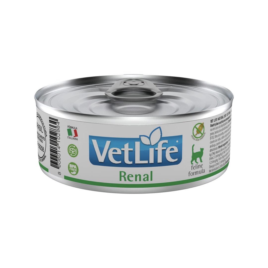 Alimento coadjuvante úmido indicado para gatos com doença renal crônica ou aguda.