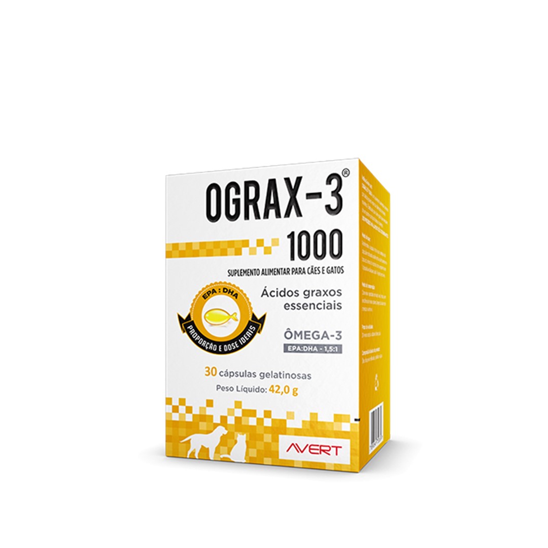 OGRAX-3 1000 é um suplemento alimentar composto por ácidos graxos essenciais derivados de peixes marinhos. É indicado para cães e gatos que necessitem um aporte nutricional desses nutrientes.